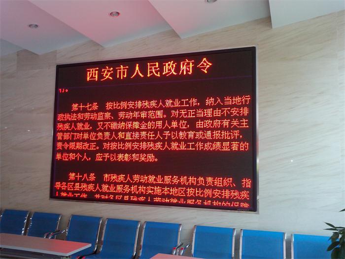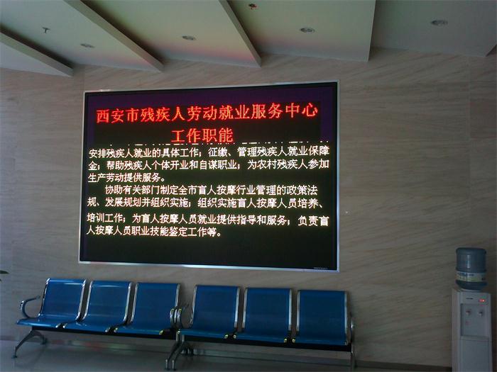 西安市殘疾人勞動就業保障服務中心,屬于西安市殘疾人聯合會的下屬單位,此次使用我公司P5表貼三合一全彩屏用于顯示與殘疾人有關的法律,法規,殘疾人就業信息。