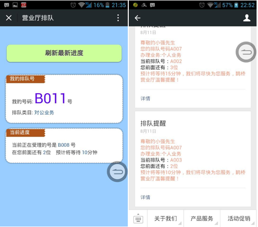 1、取號方式突破傳統取號機模式。英策微信排隊則讓用戶掃一掃二維碼即可進入排隊,在微信上可實時觀察自己面前還有多少人在排隊,做到精準排隊,微信會自動發送實時消息到粉絲手機提醒用戶以免錯過。
