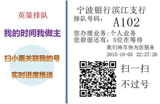 如果用傳統到營業廳取號,小票上打印出當前排隊號的微信二維碼,掃一掃,也可實時關注進度,享受微信實時推送提醒可以掃下小票上的二維碼。