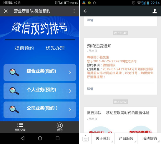 系統支持預約排隊。如想在明天10點到營業廳辦理業務,可以提前預約,系統也會提前微信通知用戶以免遺忘,預約有多種模式。