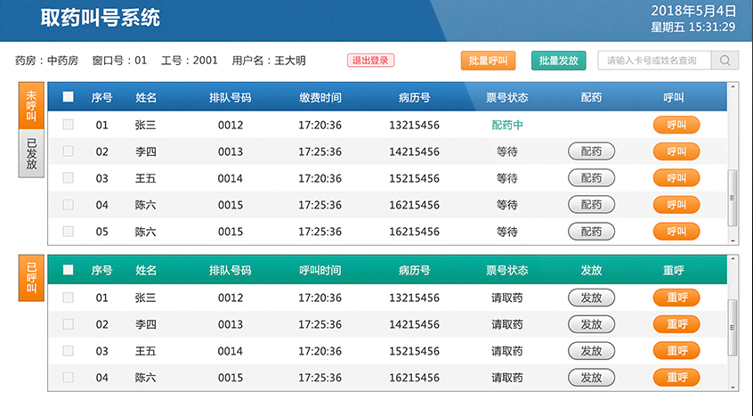 3、可顯示各窗口當(dāng)前可取藥人員信息,可進(jìn)行翻頁(yè)顯示。