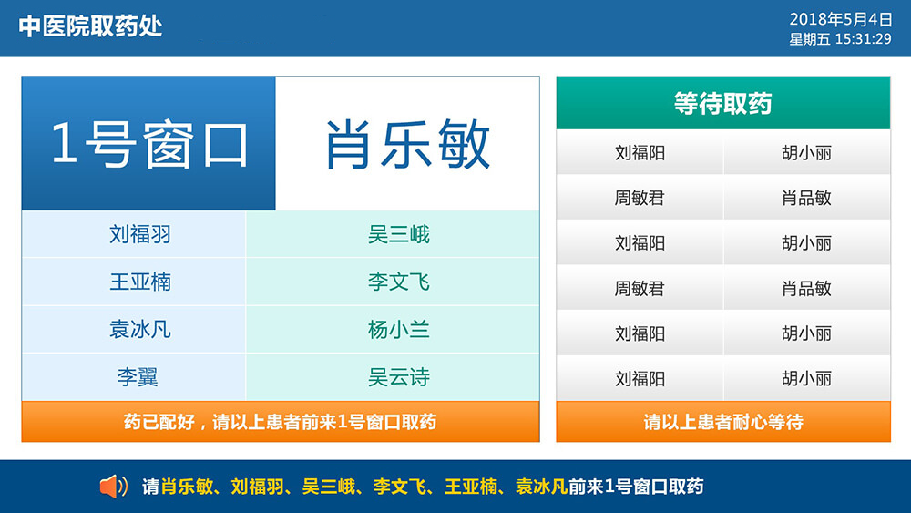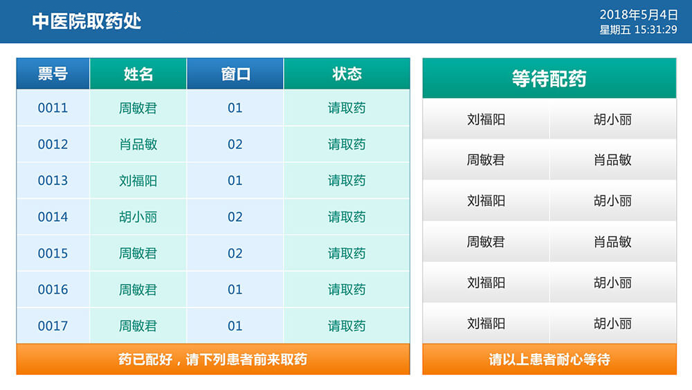 2、可顯示多位當(dāng)前呼叫的取藥人員信息,還可顯示等待及已過(guò)號(hào)取藥人員信息。